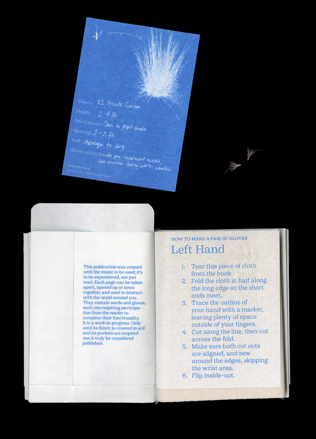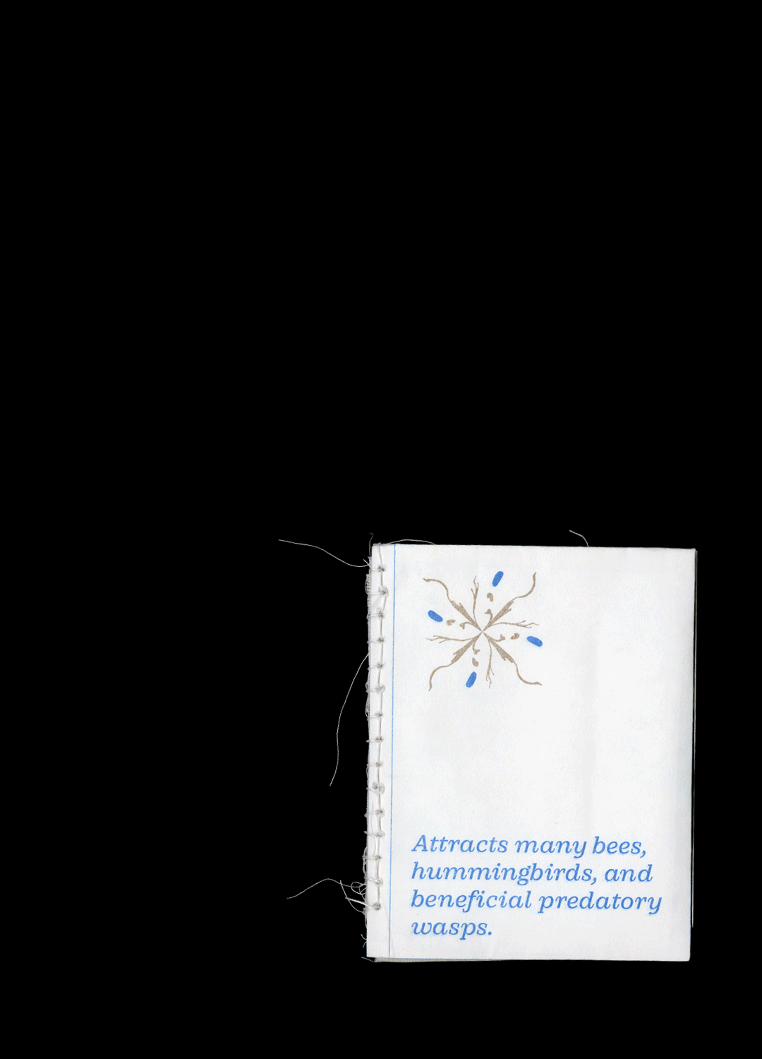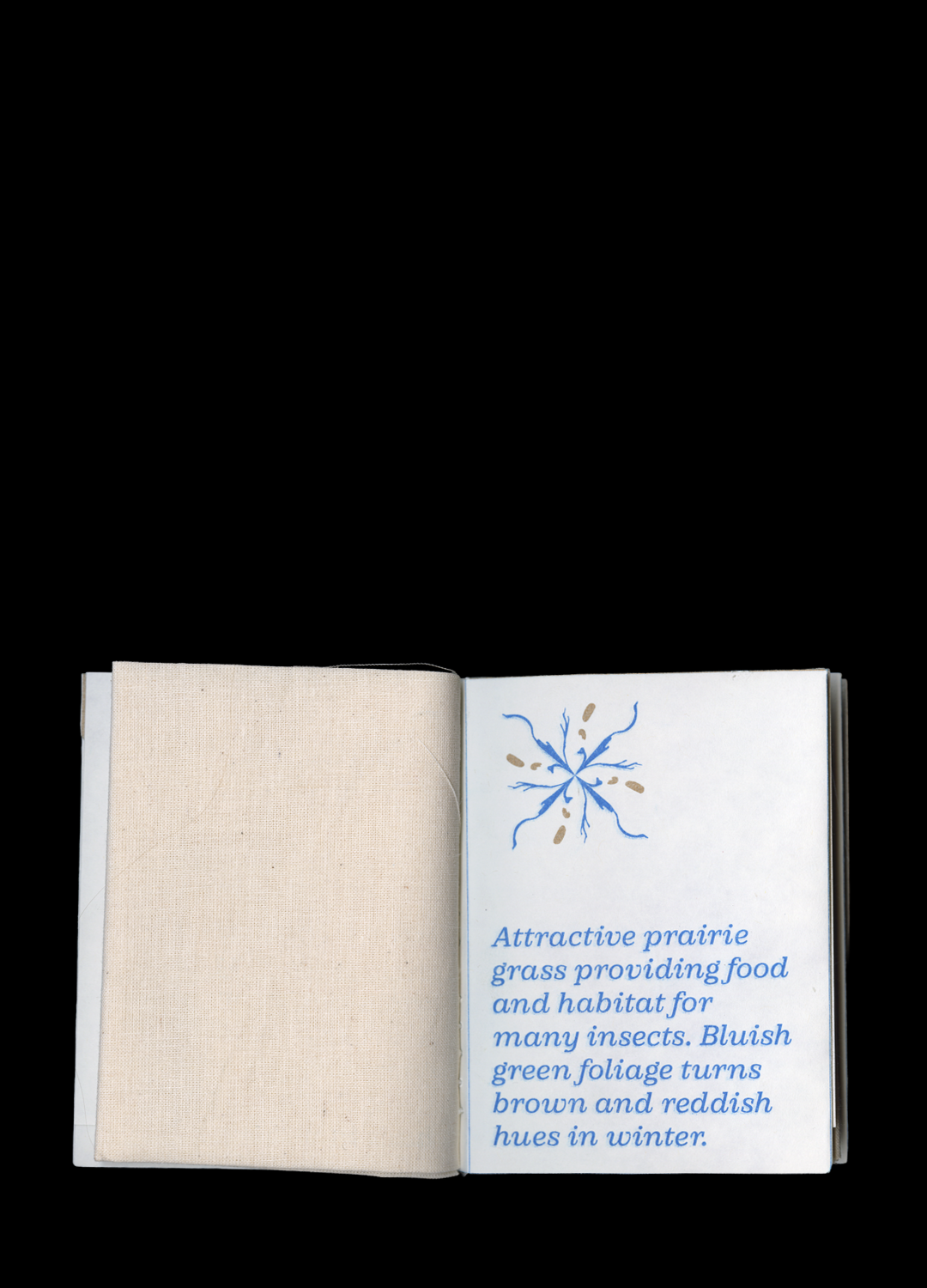3.5 x 4.5" risograph printed book, native Rhode Island seeds, cotton fabric