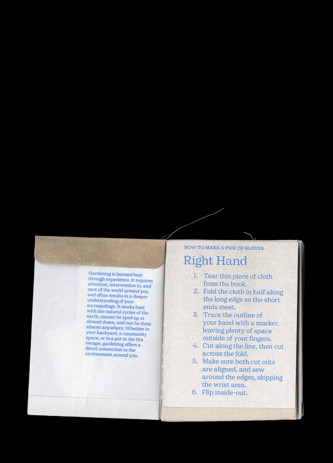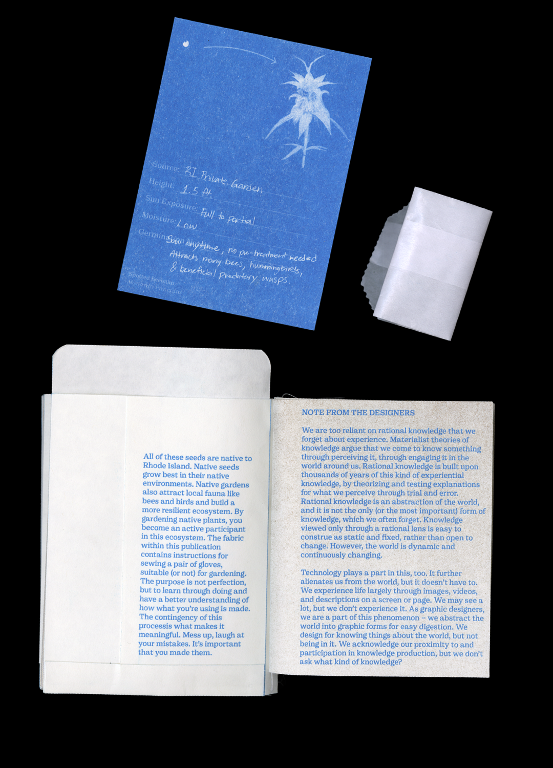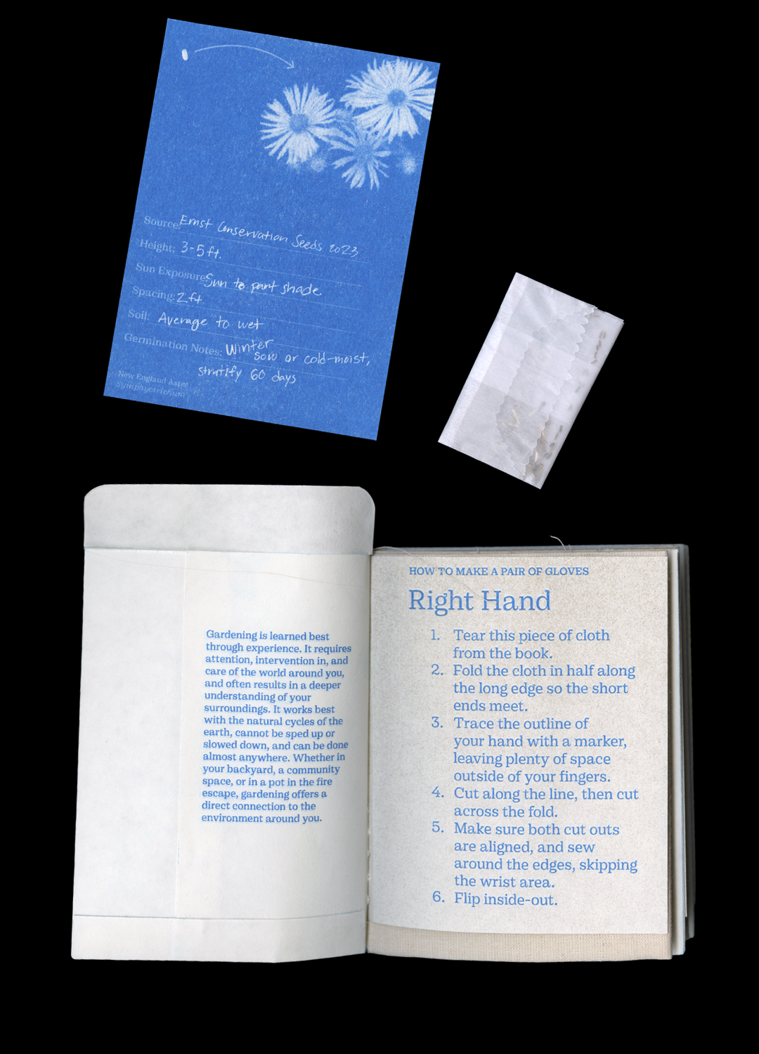 3.5 x 4.5" risograph printed book, native Rhode Island seeds, cotton fabric